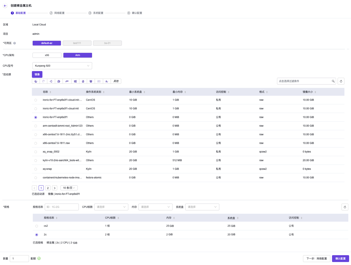 当可用区中无可用裸金属节点时,该可用区将无法被选择。当所有可用区均无法被选择时,当前配置页面的镜像和规格信息将显示为空。