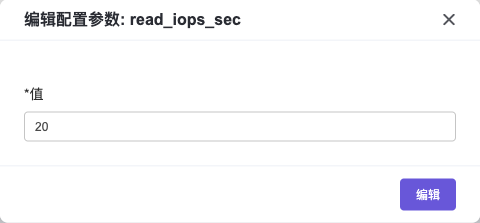 添加配置参数:选择一个已创建的QoS规则,点击表格右侧的下拉菜单,点击 添加配置参数 按钮,在弹出的添加配置参数弹窗中,选择键名称,并根据需求输入值,点击添加按钮,新的键/值就添加成功。其中,键值:total_bytes_sec表示每秒向后端存储读写的总字节数,键值read_bytes_sec表示每秒从后端存储读字节数,键值write_bytes_sec表示每秒向后端存储写字节数,键值:total_iops_sec表示每秒向后端存储读写总次数,键值:read_iops_sec表示每秒从后端存储读次数,键值:write_iops_sec表示 每秒向后端存储写次数。