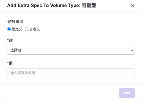 添加配置参数:选择一个已创建的云硬盘类型,点击右侧箭头展开下拉菜单,点击 添加配置参数 按钮,在弹出的弹窗中输入一对键/值,您可以选择使用预定义的键的名称或自定义的键的名称(预定义键值:volume_backup_name,用于指定该云盘类型的后端存储名), 输入配置参数值,点击添加按钮,新的键/值添加完成。