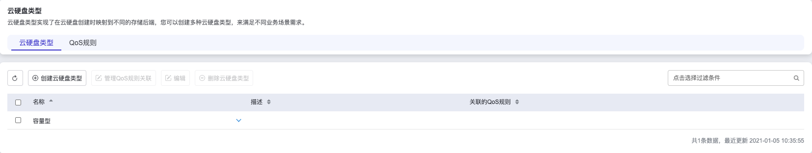 您可以为不同的云硬盘类型设置不同的QoS规则,具体创建流程如下: 点击左侧配置,点击云硬盘类型,在右侧界面顶部,点击QoS规则,切换到QoS规则页面。