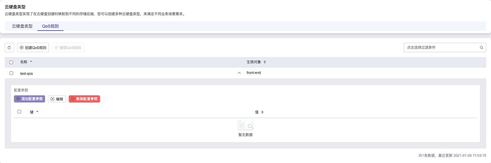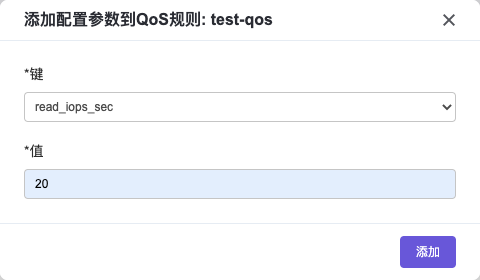 添加配置参数:选择一个已创建的QoS规则,点击表格右侧的下拉菜单,点击 添加配置参数 按钮,在弹出的添加配置参数弹窗中,选择键名称,并根据需求输入值,点击添加按钮,新的键/值就添加成功。其中,键值:total_bytes_sec表示每秒向后端存储读写的总字节数,键值read_bytes_sec表示每秒从后端存储读字节数,键值write_bytes_sec表示每秒向后端存储写字节数,键值:total_iops_sec表示每秒向后端存储读写总次数,键值:read_iops_sec表示每秒从后端存储读次数,键值:write_iops_sec表示 每秒向后端存储写次数。