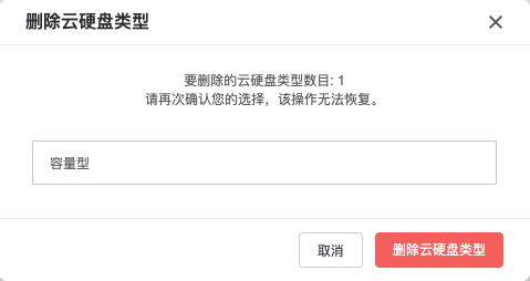 删除云硬盘类型:您可以对全局任意云硬盘类型进行删除操作,删除后的云硬盘类型将无法恢复。用户也将无法查看及使用该云硬盘类型,但已创建了云硬盘的云硬盘类型将无法删除。