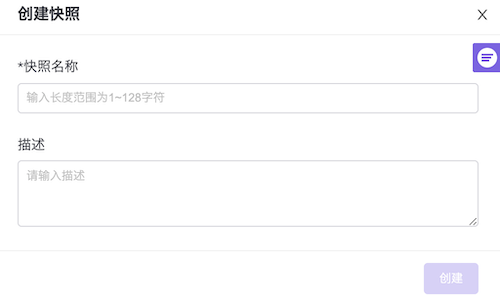 更多-创建快照,弹出“创建快照”对话框。对于“可用”状态的云硬盘,配置快照名称和描述信息,单击