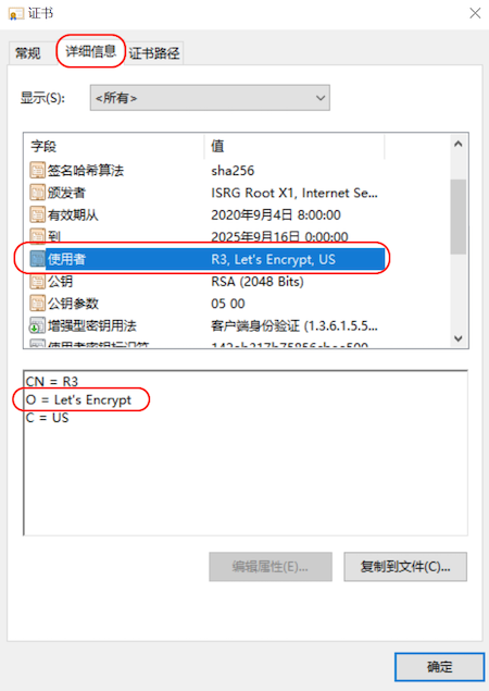 提取Let’s Encrypt CA证书。依次双击打开上述CA证书,以确认Let’s Encrypt的证书文件,该CA证书内容即为所上传证书的证书链部分内容。