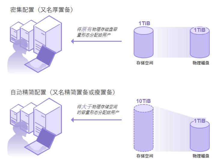 自动精简配置使用虚拟化技术使用户看起来拥有比实际可用更多的物理资源。在共享存储云平台中,自动精简配置提供一种优化存储利用率的方法。它依赖于按需分配按需使用机制,避免在传统密集配置分配方法中出现利用率低且被占用但不使用的情况。 说明:云平台中概览页面展示的存储配额是实际存储容量大小,不影响存储配额分配。 下图描述“密集配置”和“自动精简配置”的区别: