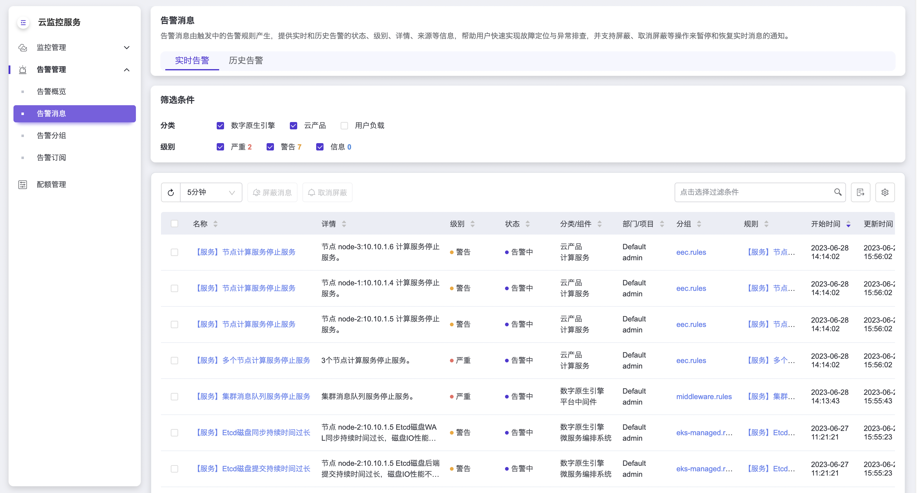 实时告警页签展示的是正在告警的告警消息,筛选条件下方的是实时告警列表,包括告警消息的名称、详情、级别、状态、分类、组件、所属部门和项目(仅云管理员用户可见)、对应分组和规则、开始时间、更新时间和操作。