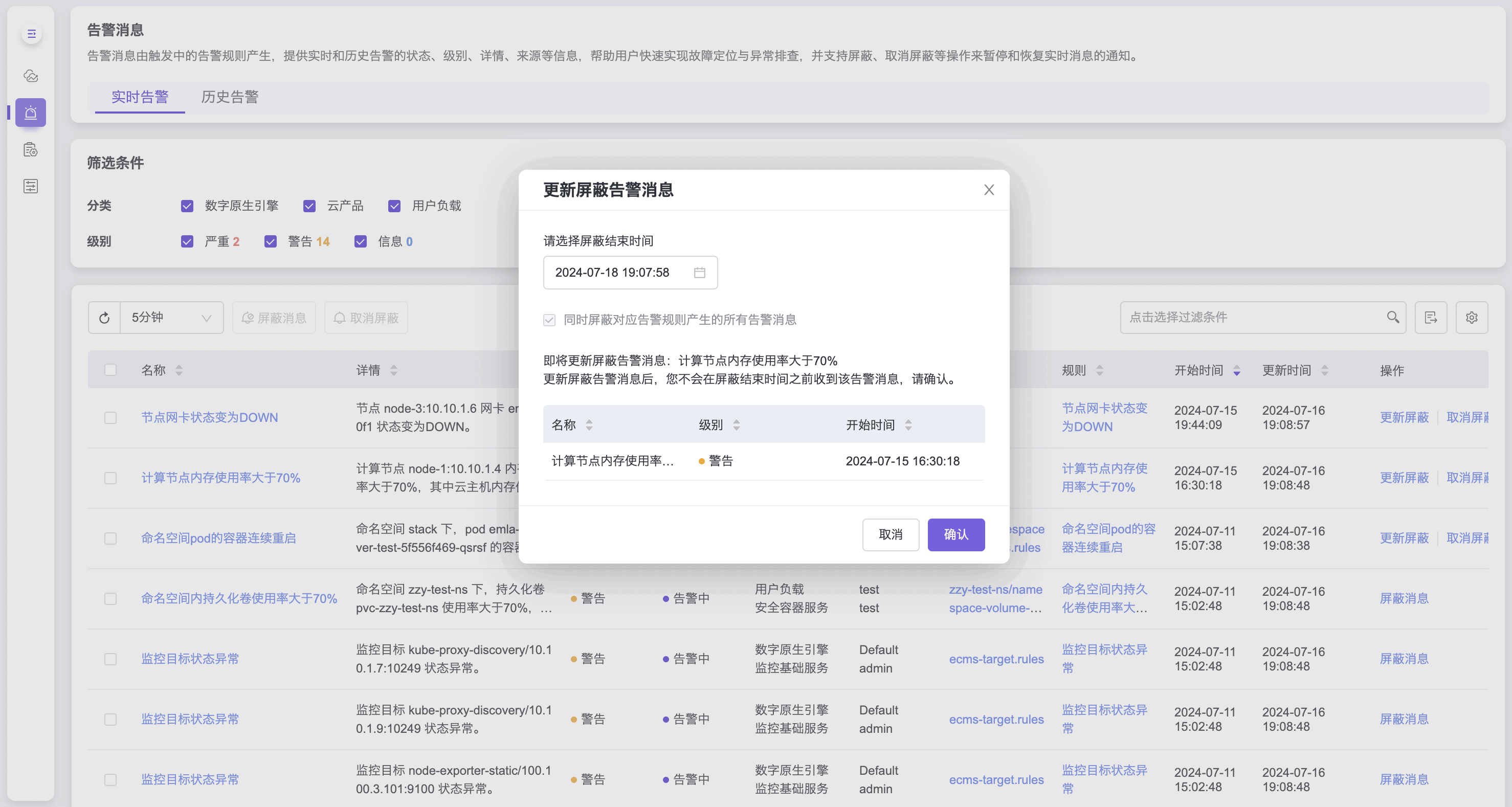 屏蔽消息操作可暂停实时告警消息的通知推送,操作后的告警消息状态将由告警中变为已屏蔽: