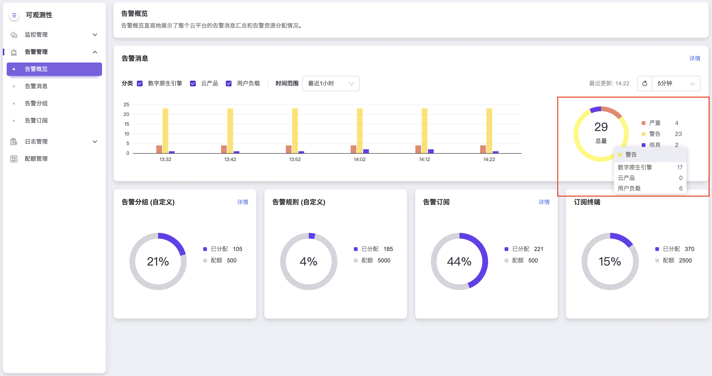 本章节主要介绍在告警概览页面中,针对云平台或项目整体告警资源信息的概括说明,帮助用户快速了解告警消息统计和配额分配情况,包括告警消息时间和级别分布,告警分组(自定义)、告警规则(自定义)、告警订阅和订阅终端配额分配。其中,在云平台的顶部导航栏中,依次选择[产品与服务]-[可观测性]-[告警管理]后,在左侧导航栏中选择[告警概览],即可访问“告警概览”页面。
