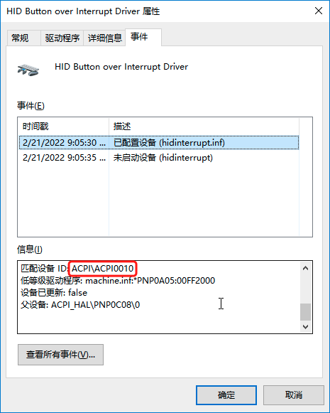 2. 点击“HID Button over Interrupt Driver”,查看警告对应的设备ID是ACPI\ACPI0010。