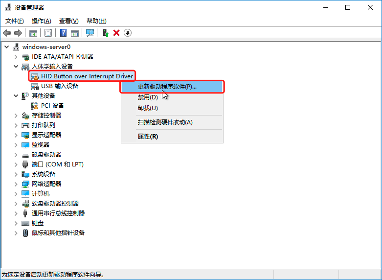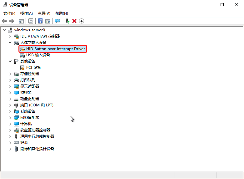 在虚拟机内打开设备管理器(Device Manager),发现”HID Button over Interrupt Driver”驱动显示一个警告符。