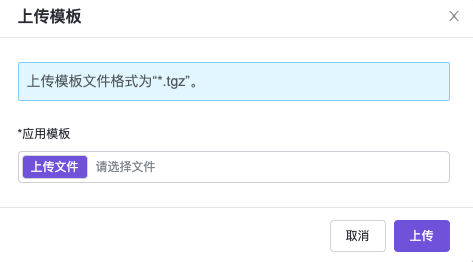 说明: 模板文件命名需符合“name-version.tgz”的规范。 在顶部导航栏依次选择[产品与服务]-[容器服务]-[容器应用中心],进入“容器应用中心”服务。 在左侧导航栏选择[应用模板],进入“应用模板”页面。 选择[共享模板]或[自有模板]页签。 单击 上传模板,弹出“上传模板”对话框。 单击 上传文件,选择本地的模板文件。 单击 上传 完成操作。