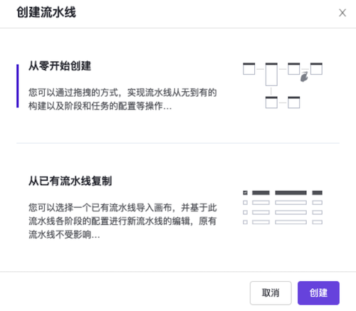 创建流水线,弹出“创建流水线”对话框。在“创建流水线”对话框中,选择“从零开始创建”后,单击