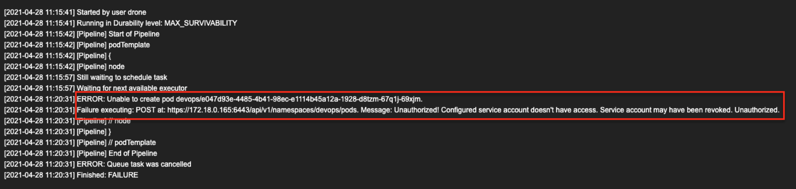 当执行流水线时,执行状态显示失败。之后,在查看此次运行记录的详情时,发现提示Unable to create pod XX报错。