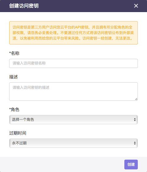 对于平台中的任意用户,可以创建访问密钥。访问密钥是第三方用户(云平台外的用户)访问您云平台的API密钥,并且拥有所分配角色的全部权限。所以当您创建访问密钥后,需要妥善处理,不要通过任何方式将该访问密钥公布到外部渠道,以免被利用而给您的云平台带来风险。访问密钥一经创建,无法修改。