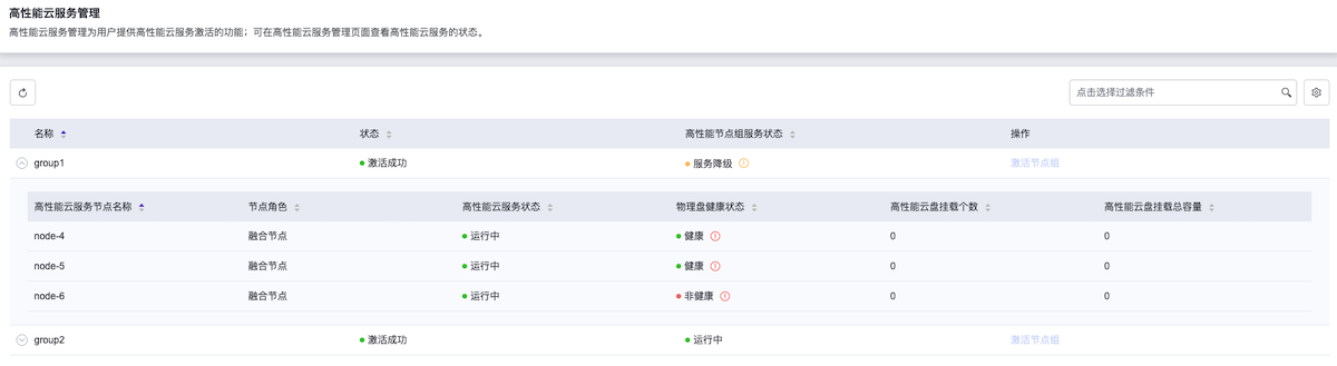 | 待激活 | 即高性能节点组还未激活。待激活:包含两种场景,一是安装高性能云存储后未进行过初始化配置操作,二是有扩容或更换磁盘等维护操作后未重新激活。 |