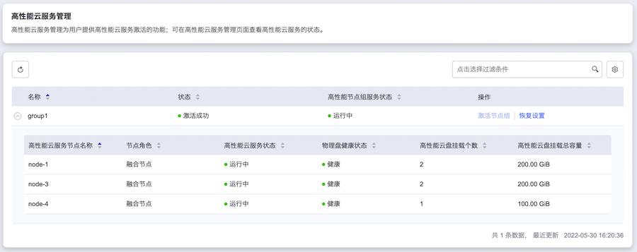 | 激活成功 | 节点组内的高性能云服务均为可用状态,即高性能节点组可提供高性能云服务。 |