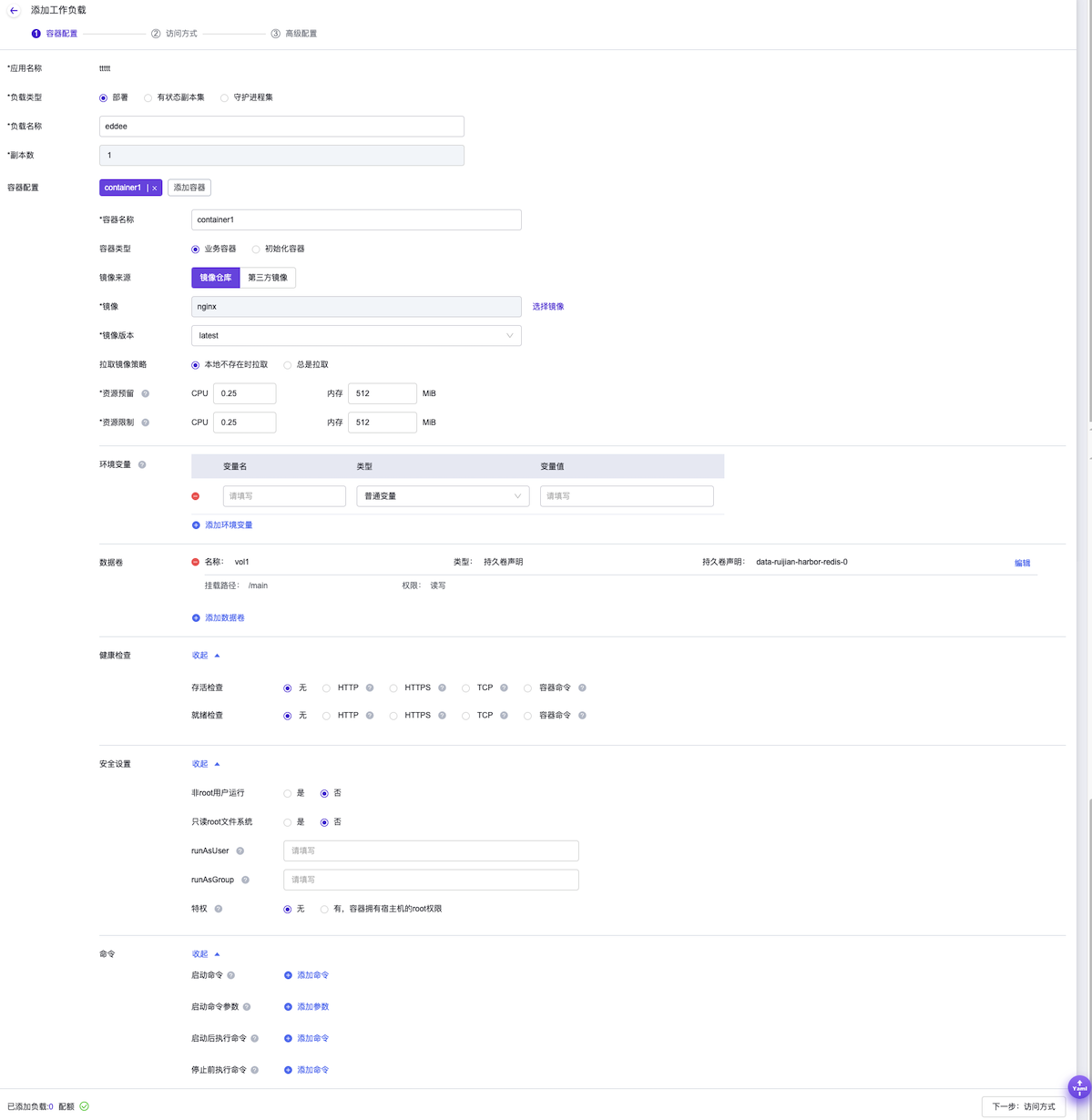 完成一个容器的配置后,若需要添加多个容器可单击添加容器,否则单击下一步:访问方式进入“访问方式”配置页面。