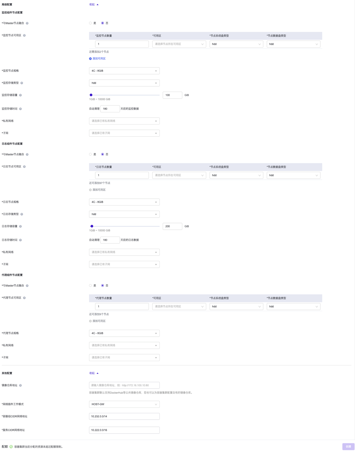当“与Master节点融合”参数选择“否”时需配置。监控节点创建到不同的可用区以实现容灾高可用。当集群master节点数>1时,集群监控节点数为3个节点。同时需设置节点系统盘类型、数据盘类型。若所需类型不存在,可在[产品与服务]-[块存储]-[云硬盘类型]页面配置。 |