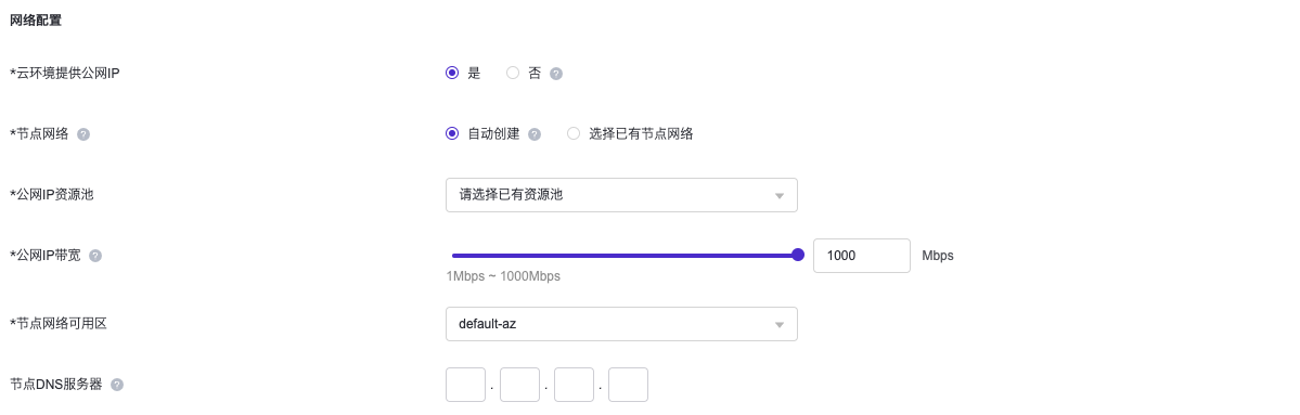 当“节点网络”参数配置为“自动创建”时需配置此参数。节点默认采用8.8.8.8作为DNS服务器,也可以为节点添加其它DNS服务器。 |