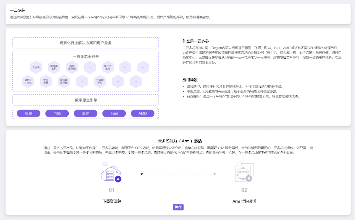 本操作用于在已安装的多架构服务中,下载所需资源包并激活多架构。 在顶部导航栏中,依次选择[产品与服务]-[一云多芯]后,选择[Arm架构]或[x86_64架构]子菜单,进入“一云多芯”页面。 单击 执行 ,开始依次执行检查环境健康状态、下载资源包和激活多架构操作。 说明: 在执行过程中,如有报错,请先联系技术支持协助解决,再单击 重试 ,继续执行当前操作。