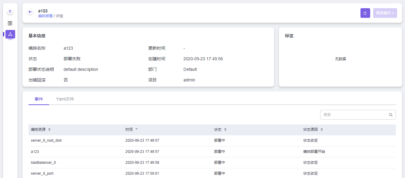 - 概览:概览页面会显示当前编排资源的基本信息,如编排名称、创建时间、编排状态、状态说明以及是否回滚等。