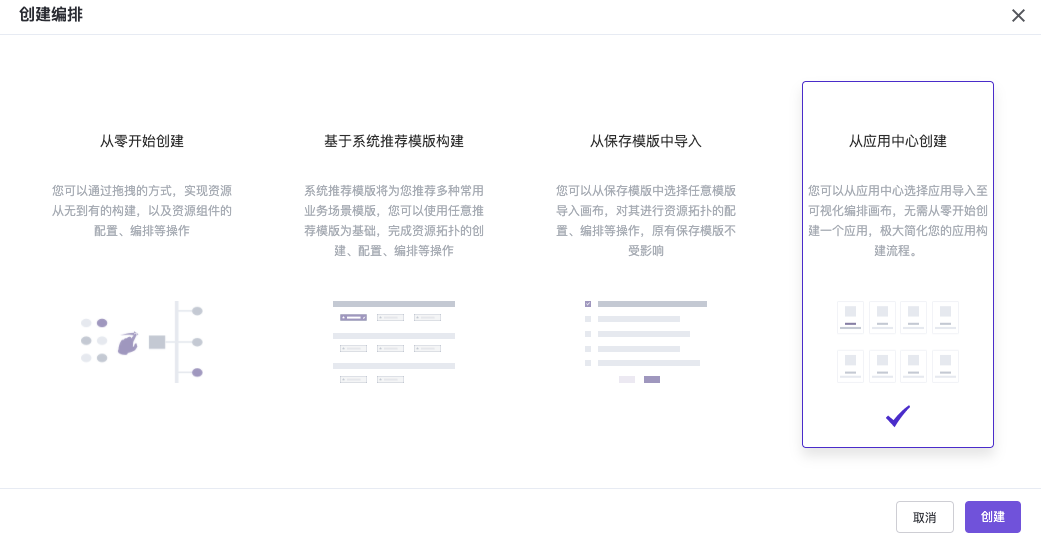从应用中心创建:当您通过可视化编排创建生成一个应用后,您可以将其再次导入可视化编排中,生成为一个模版、修改为一个新的应用或者是应用版本。避免了您重复构建一个复杂的应用拓扑,极大简化您的步骤。