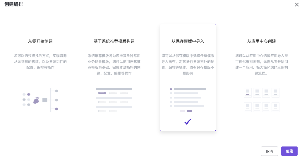 在编排模版页面点击 创建模版,跳出如下弹窗,选择 从保存模版中导入,点击确定。
