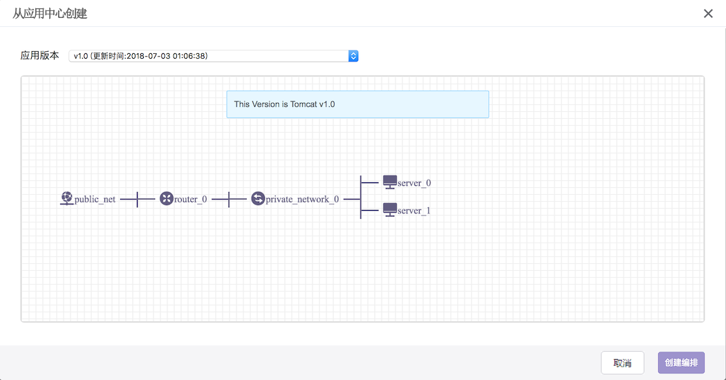 在页面中选择您需要引用创建的应用并点击,页面切换后,选择您需要的当前应用的某个版本。在下方画布中,您可以看到当前选择版本的应用拓扑图。点击 创建编排 您将进入画布中。