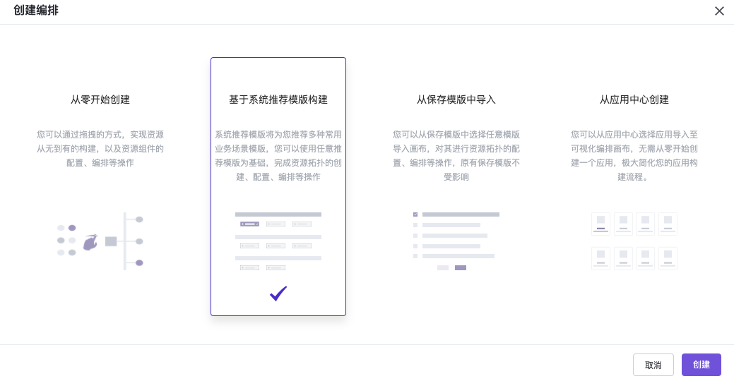 基于系统推荐模版构建:当用户对平台资源、业务资源不太熟悉时,可选择该创建方式,用户可以使用系统推荐模版完成资源拓扑的编排、创建以及配置等操作。对于熟悉平台的用户来说,可以迅速配置所需资源架构,减少编排时间。此外,用户进入画布后对模版资源的编辑、修改不会影响到原模版。