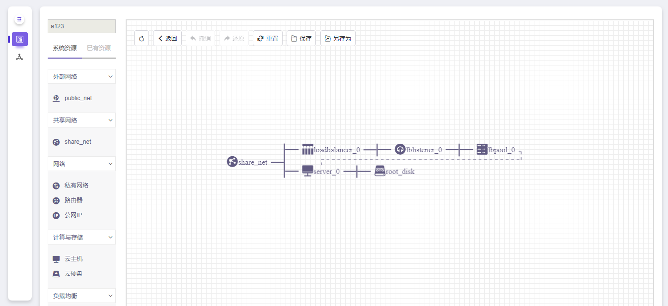 2.已有资源中的路由器一定连接了某个外部网络资源,所以拖入 已有资源 > 路由器 时,也将拖入某个外部网络进入画布中。