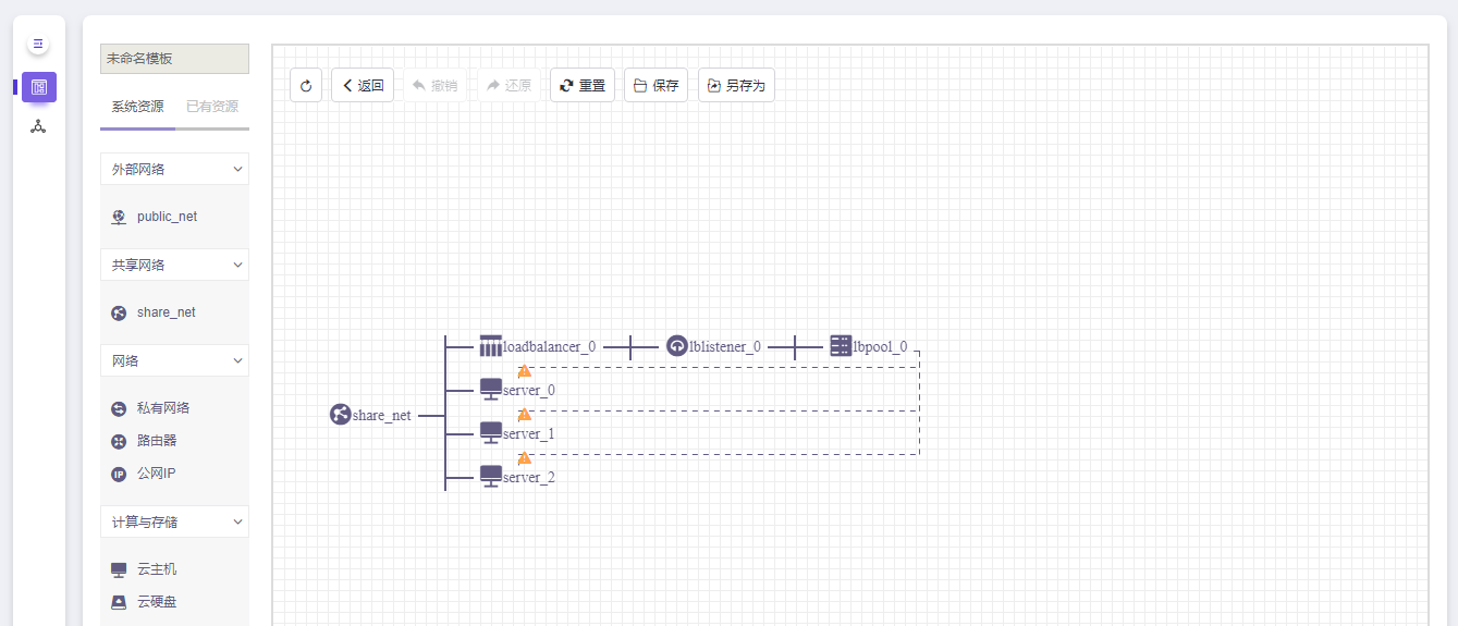2.此时画布上的呈现资源为已选择的 共享网络云主机集群 资源,用户可对该模版进行编辑部署,增加 云主机、云硬盘、负载均衡器 数量,或更改资源配置,操作如上文中的 从零开始创建。