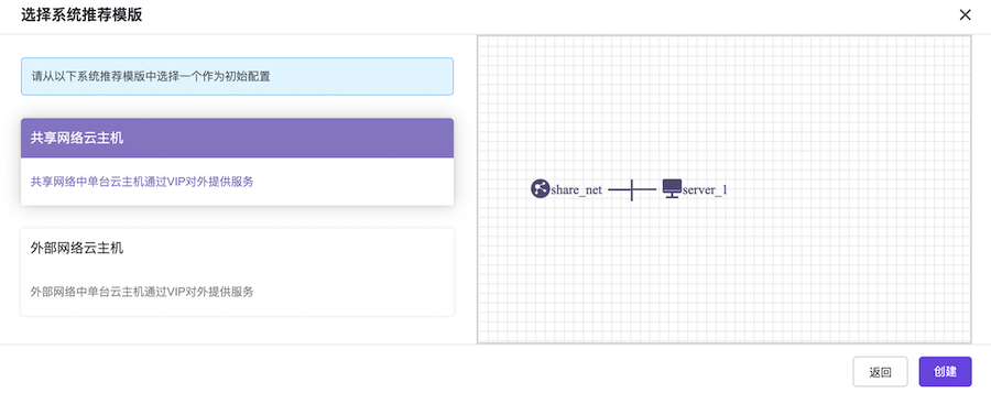 用户可以选择 共享网络云主机和 外部网络云主机,根据不同场景需求,选择不同类型系统推荐模版,同时右侧也会出现模版相应的可视化图形以及模版描述,方便用户对模版理解,做出合适选择。如下以共享网络云主机为例。