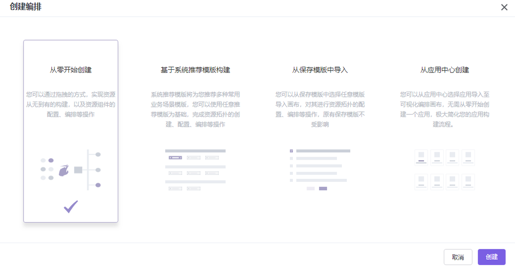 从零开始创建:手动创建方式为用户最常用的编排创建方式,用户可以在可视化画布中通过拖拽的方式完成资源拓扑的编排、创建、配置等操作。拖拽的资源依赖平台设定的逻辑关系进行感应式关联,无须用户主动判定资源逻辑关系。