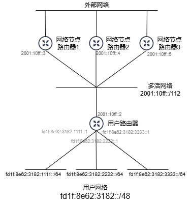 | 用户路由器 | * 名称:user_router * 路由器连接: - 子网:multi_net_ipv6_default_ipv6_subnet: 2001:10ff::/112;子网IP:2001:10ff::2 - 子网:user_network_default_ipv6_subnet: fd1f:8e62:3182:1111::/64;子网IP:fd1f:8e62:3182:1111::1 - 子网:user_network_default_ipv6_subnet2: fd1f:8e62:3182:2222::/64;子网IP:fd1f:8e62:3182:2222::1 - 子网:user_network_default_ipv6_subnet3: fd1f:8e62:3182:3333::/64;子网IP:fd1f:8e62:3182:3333::1 * 静态路由: - 目的CIDR:::/0;下一跳:2001:10ff::3 - 目的CIDR:::/0;下一跳:2001:10ff::4 - 目的CIDR:::/0;下一跳:2001:10ff::5 |