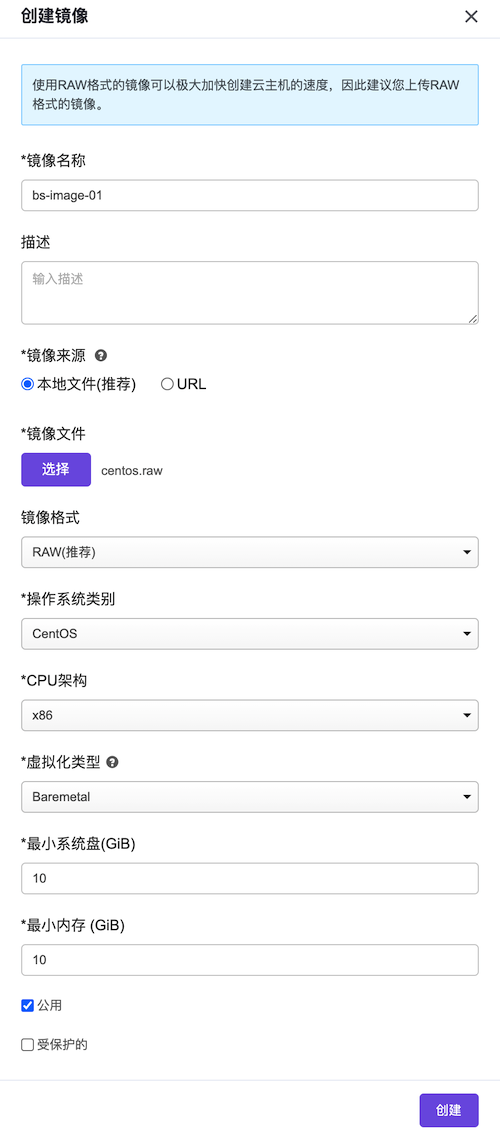 3. 在“创建镜像”对话框中,“CPU架构”根据实际镜像文件选择,“虚拟化类型”选择“Baremetal”,并输入其他镜像信息后,单击 创建 ,完成裸金属主机镜像的创建,并关闭对话框。其中,“创建镜像”对话框中部分参数的具体说明,请参考“计算”帮助中“云主机镜像”的相关内容。