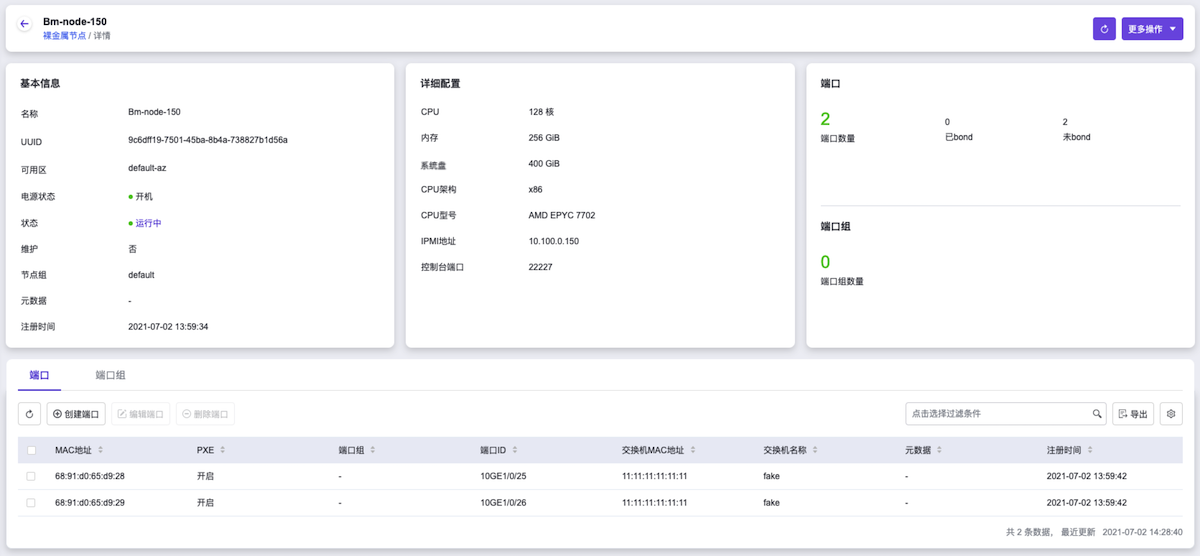 在“裸金属节点”页面中,单击裸金属节点名称 ,可进入其详情页面。在详情页面中,可查看该裸金属节点的基本信息、详细配置和端口、端口组信息。