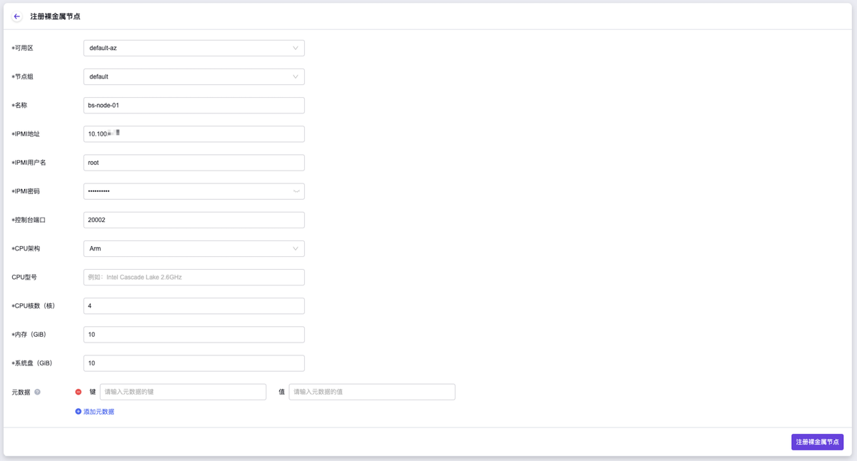 注册裸金属节点,开始注册裸金属节点,并关闭当前页面。参数 说明 可用区 该裸金属节点的所在可用区。请选择上述前提准备操作中新建的可用区。 节点组 该裸金属节点的所在节点组。请直接选择由系统自动生成的参数值即可。 名称 该裸金属节点的名称。 IPMI地址 该裸金属节点的IPMI地址,即BMC(基板管理控制器)的访问地址。 IPMI用户名 该裸金属节点的IPMI用户名,即登录BMC(基板管理控制器)的用户名。 IPMI密码 该裸金属节点的IPMI密码,即登录BMC(基板管理控制器)的密码。 控制台端口 该裸金属节点的控制台端口号。该参数值范围为20000~40000。在配置时请确保云平台中各裸金属节点的控制台端口号互不相同。 CPU架构 该裸金属节点的CPU架构。该参数值可选Arm 或 x86。 CPU型号(可选) 该裸金属节点的CPU型号。 CPU核数 该裸金属节点的CPU核数。 内存 该裸金属节点的内存容量。 系统盘 该裸金属节点的系统磁盘容量。 元数据(可选) 该裸金属节点的附加信息,可以用来区分同种配置的多个节点。该参数值以键值对形式存储。