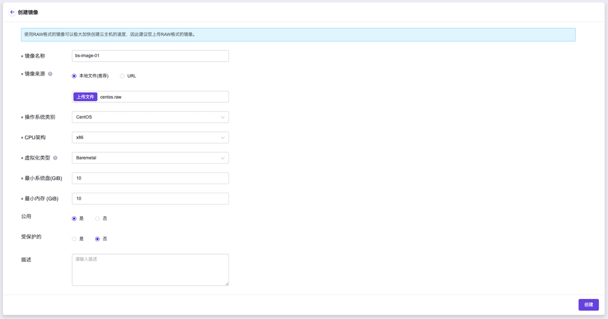 本操作用于预先制作并上传裸金属主机创建时所需要的镜像文件。