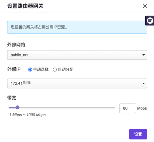 更多操作,在下拉列表中选择“设置网关”,弹出“设置路由器网关”对话框。在该对话框中,配置外部网络、外部IP和带宽后,单击设置,完成路由器网关设置,并关闭对话框。