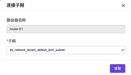 连接子网,弹出“连接子网”对话框。在该对话框中,选择上述新建网络的子网后,单击连接,完成路由器的子网连接,并关闭对话框,返回该路由器详情页面。在该路由器详情页面中,单击页面上方的