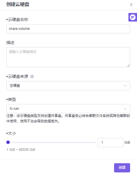 创建,完成云硬盘的创建,并关闭对话框(如果云硬盘类型支持共享盘会存在提示,普通云硬盘类型则没有共享盘提示)。其中,各参数的具体说明,请参考“块存储”帮助中“云硬盘”的相关内容。