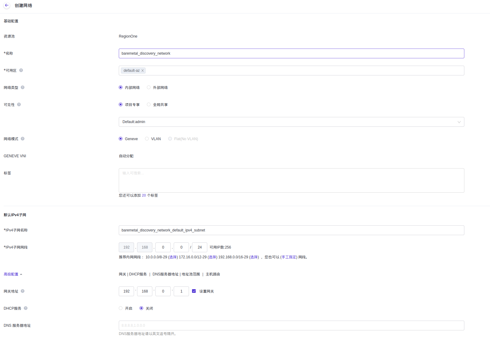 在创建裸金属节点发现网络时,若不划分网络可用区,则网络名称请输入“baremetal_discovery_network”;若划分网络可用区,则网络名称请输入“baremetal_discovery_network_<网络可用区名称>”。