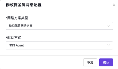 修改,弹出“修改裸金属网络配置”对话框。在“修改裸金属网络配置”对话框中,配置网络方案后,单击