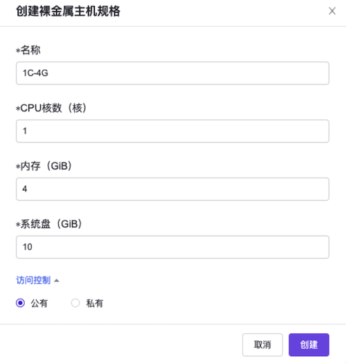 创建,开始创建裸金属主机规格,并关闭对话框。参数 说明 名称 该裸金属主机规格的名称。该参数值的输入格式可参考1C-2G,即CPU核数为1,内存为2的裸金属主机规格。 CPU核数 该裸金属主机规格的CPU核数。 内存 该裸金属主机规格的内存容量。 系统盘 该裸金属主机规格的系统磁盘容量。 访问控制 该裸金属主机规格的访问限制。该参数值可选公有或私有。