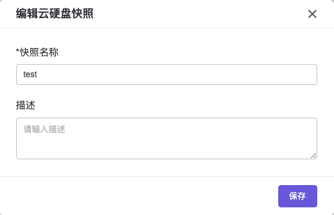 若需要修改某个云硬盘快照的基本信息,如名称、描述等,选择该云硬盘快照,点击 更多-编辑,编辑新的名称或描述,点击保存,即可完成云硬盘快照编辑,如图所示: