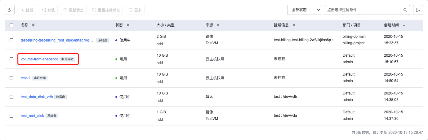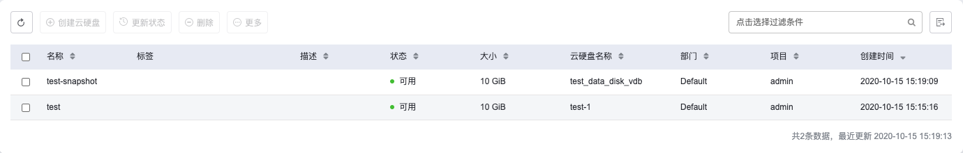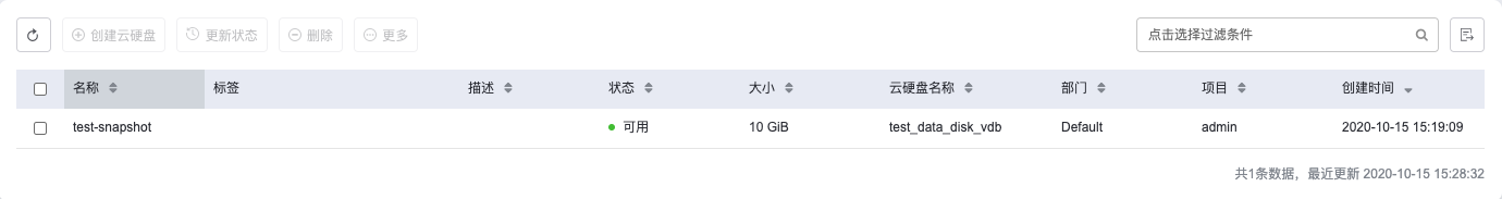 新建的云硬盘快照可以从 存储-云硬盘快照 列表中查询,若快照状态为”可用”,即表示创建成功,如图所示: