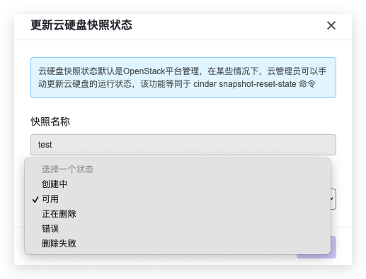 更新云硬盘快照状态: 出于业务需求,您可以手动更新云硬盘快照的状态为创建中、可用、正在删除、错误、删除失败等。