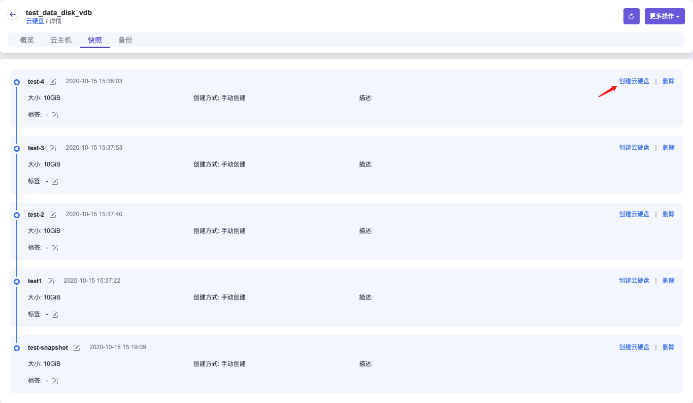 新建的云硬盘快照,也可以在该云硬盘详情页的快照Tab页中查看。详情页中云硬盘快照以快照链的形式展现,按照时间由上到下展示最新时间节点创建的云硬盘快照,如图所示: