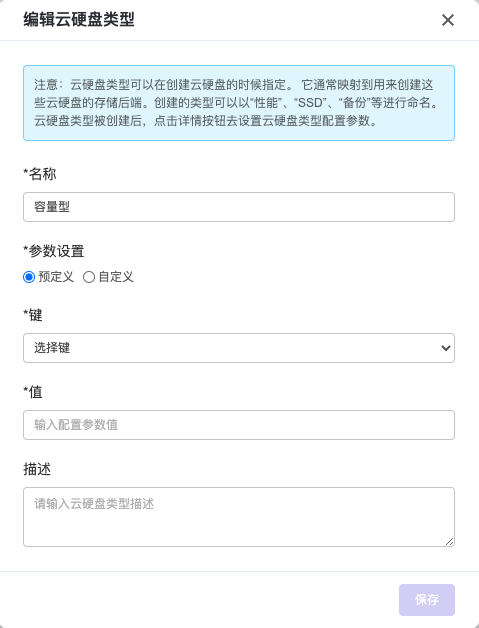 创建云硬盘类型 :点击左侧导航栏配置,点击云硬盘类型,在界面右侧点击 创建云硬盘类型 按钮,此时页面弹出创建云硬盘类型的弹窗,在页面中输入 名称 ,然后 添加参数配置 ,输入一对键/值。您可以选择选择使用预定义的键的名称或自定义的键的名称(预定义键值:volume_backup_name,用于指定该云盘类型的后端存储名), 输入配置参数值,填写 描述 (描述为选填), 最后点击 创建 按钮,云硬盘类型创建完成。
