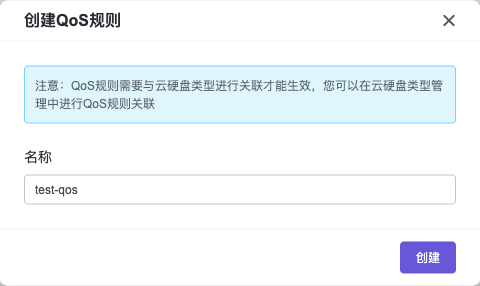 创建 QoS 规则:点击创建 QoS 规则按钮。在弹出的创建 QoS 规则弹窗中, 输入 QoS 规则名称,点击创建按钮,新的 QoS 规则即可完成创建。